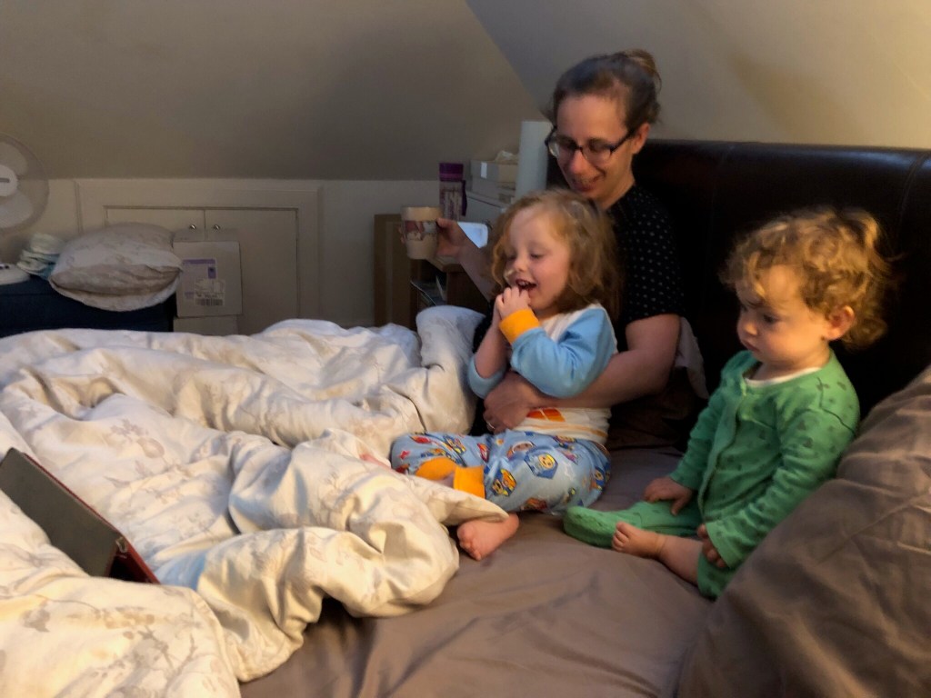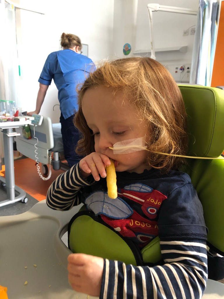 He still has his NG tube because he hasn’t managed to start drinking yet, but we’re able to cope with that for the moment. I’m sure he will start drinking, as soon as he is able to hold his cup himself. But it is nice to see him in his own surroundings. He knows where everything is, he sleeps in his own bed, goes out to look at trains at the station, shares a bath with his sister. It feels so much more natural.